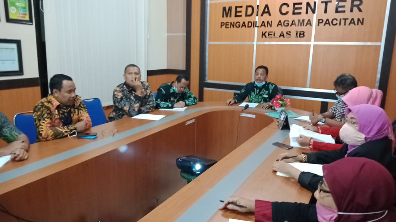Bertempat di Media Center PA Pacitan tepat Pukul 08.00 WITA pada hari Kamis Tanggal 03 desember 2020 berlangsung rapat Kepatuhan dan evaluasi Sistem Informasi Penelusuran Perkara (SIPP) pada Satker Pengadilan Agama Pacitan. Rapat tersebut dipimpin oleh Wakil Ketua Pa Pacitan Bapak Muhamad Rizki, S.H. Hadir pada kesempatan itu semua stakeholders dan para User SIPP yaitu Panitera, Para Hakim T, Para Panitera Pengganti dan Para Pejabat Struktural Teknis Yudisial dan Tim IT PA PACITAN. Rapat dalam suasana pandemi Covid-19 ini tetap mengacu pada standar kesehatan yaitu para peserta rapat satu sama lainnya tetap jaga jarak aman (social distancing) dan menggunakan masker.