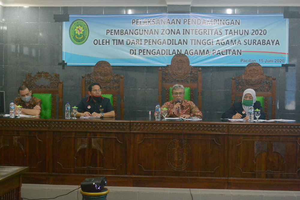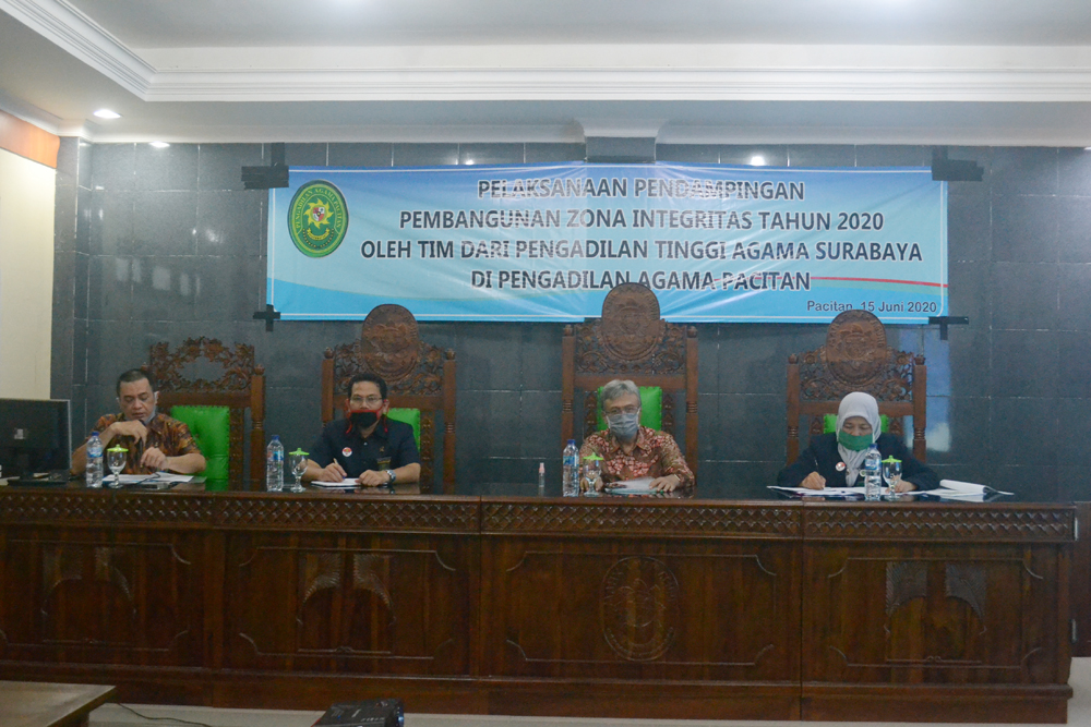 Pengadilan Agama Pacitan berkesempatan masuk dalam usulan Peradilan yang mengikuti Pembangunan Zona Integritas tahun 2020. berkaitan dengan ini, Pengadilan Tinggi Agama Surabaya melakukan Pendampingan Pembangunan Zona Integritas di Pengadilan Agama Pacitan.