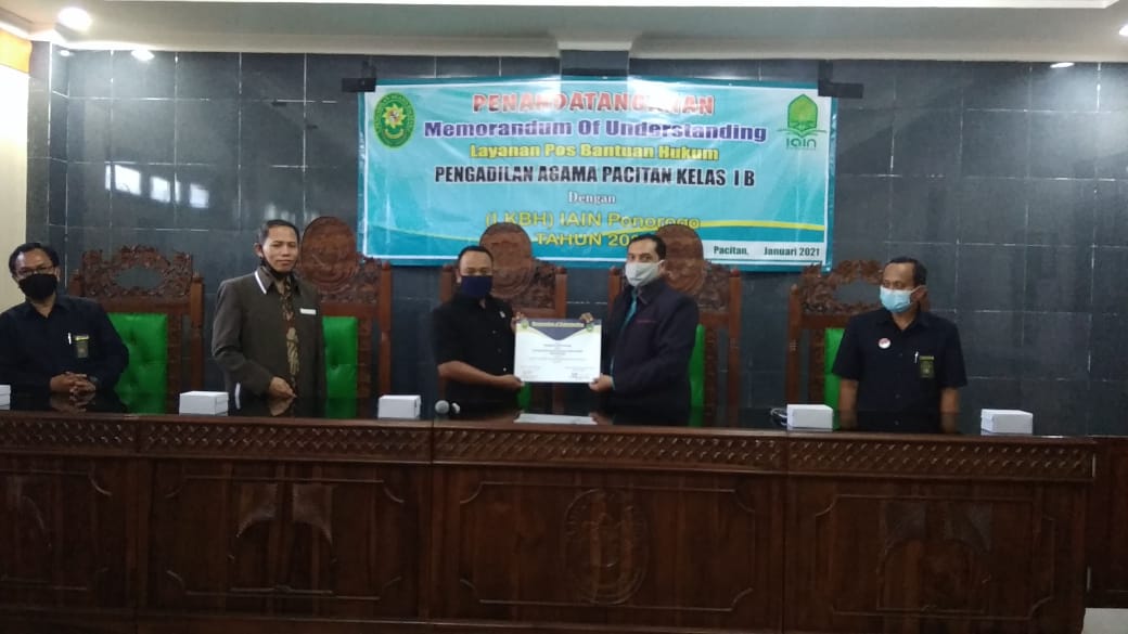 Bertempat di ruang sidang 1 Pengadilan Agama Pacitan hari Senin tanggal 4 Januari 2021, berlangsung kegiatan penandatanganan Surat Perjanjian Kerjasama / MOU Pengadilan Agama Pacitan dengan LKBH IAIN Ponorogo sebagai penyedia jasa layanan Posbakum untuk Tahun Anggaran 2021. Acara dimulai dengan pembacaan basmalah bersama-sama kemudian dilanjutkan Sambutan dari Wakil Ketua Pengadilan Agama Pacitan Bapak Muhamad Rizki, S.H yang didampingi Panitera dan Sekretaris Pengadilan Agama Pacitan. Beliau menyampaikan harapannya kepada LKBH IAIN Ponorogo bahwa bersama sama memberikan pelayanan prima dan optimal kepada masyarakat pencari keadilan di Pengadilan Agama Pacitan. Kegiatan ditutup dengan penanda tanganan dan serah terima Surat Perjanjian Kerjasama / MOU Pengadilan Agama Pacitan dengan LKBH IAIN Ponorogo.