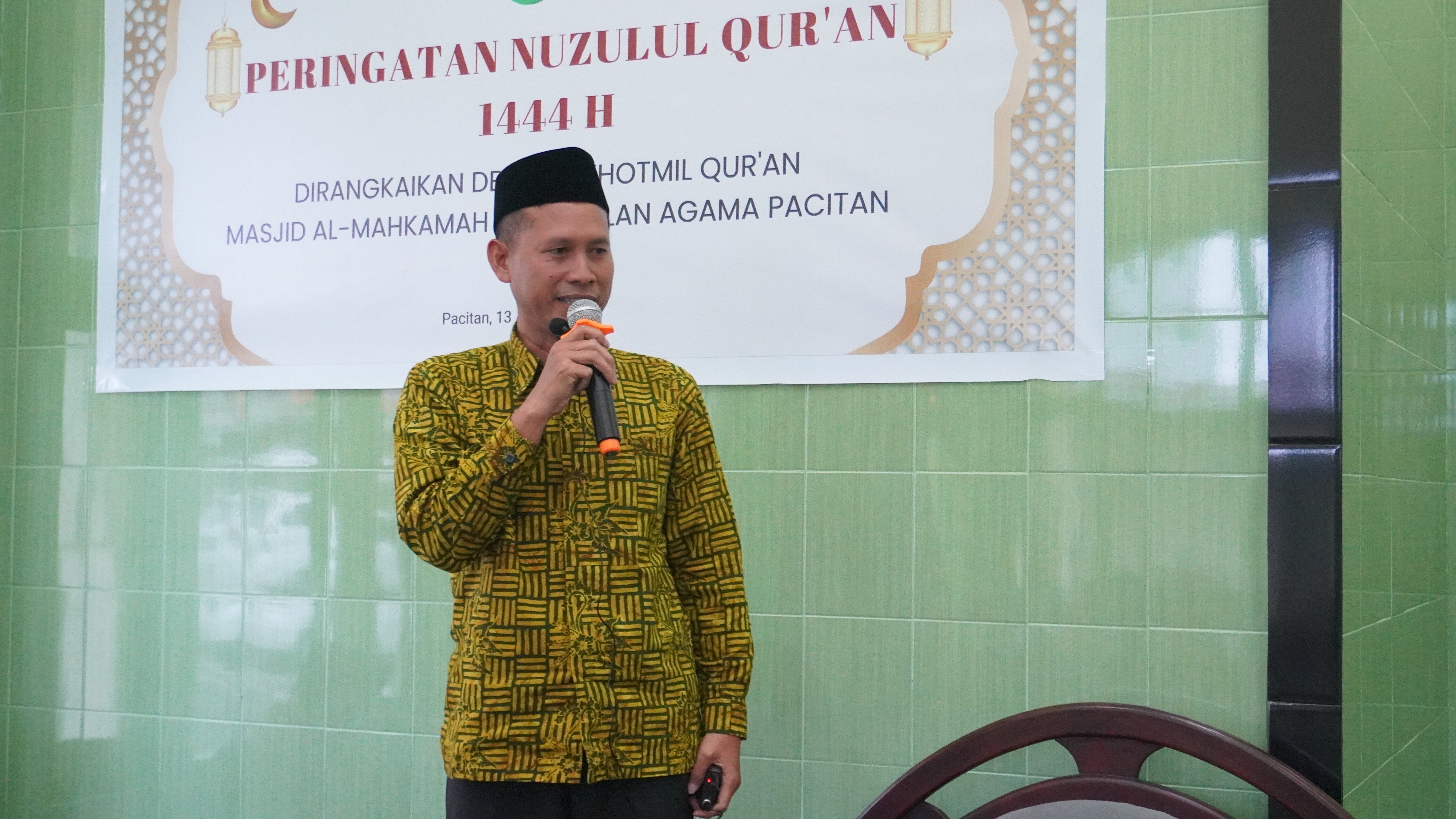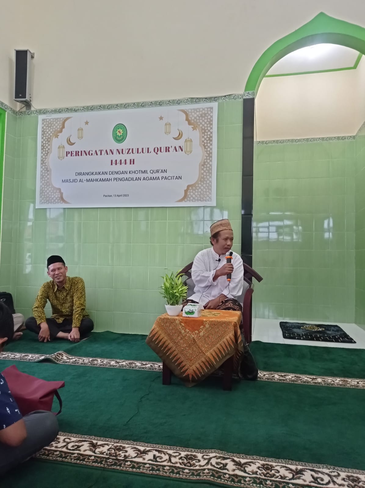 Pacitan- Kamis, 13 April 2023 bertepatan tanggal 22 Ramadhan 1444 H bertempat di Masjid Al-Mahkamah, Pengadilan Agama Pacitan memperingati Nuzulul Qur'an yang dirangkai dengan Khotmil Qur'an. Acara khataman qur'an ini merupakan puncak dari kegiatan rutin tadarus Al-Qur'an yang dilaksanakan di Pengadilan Agama Pacitan pada bulan suci Ramadhan tahun ini.