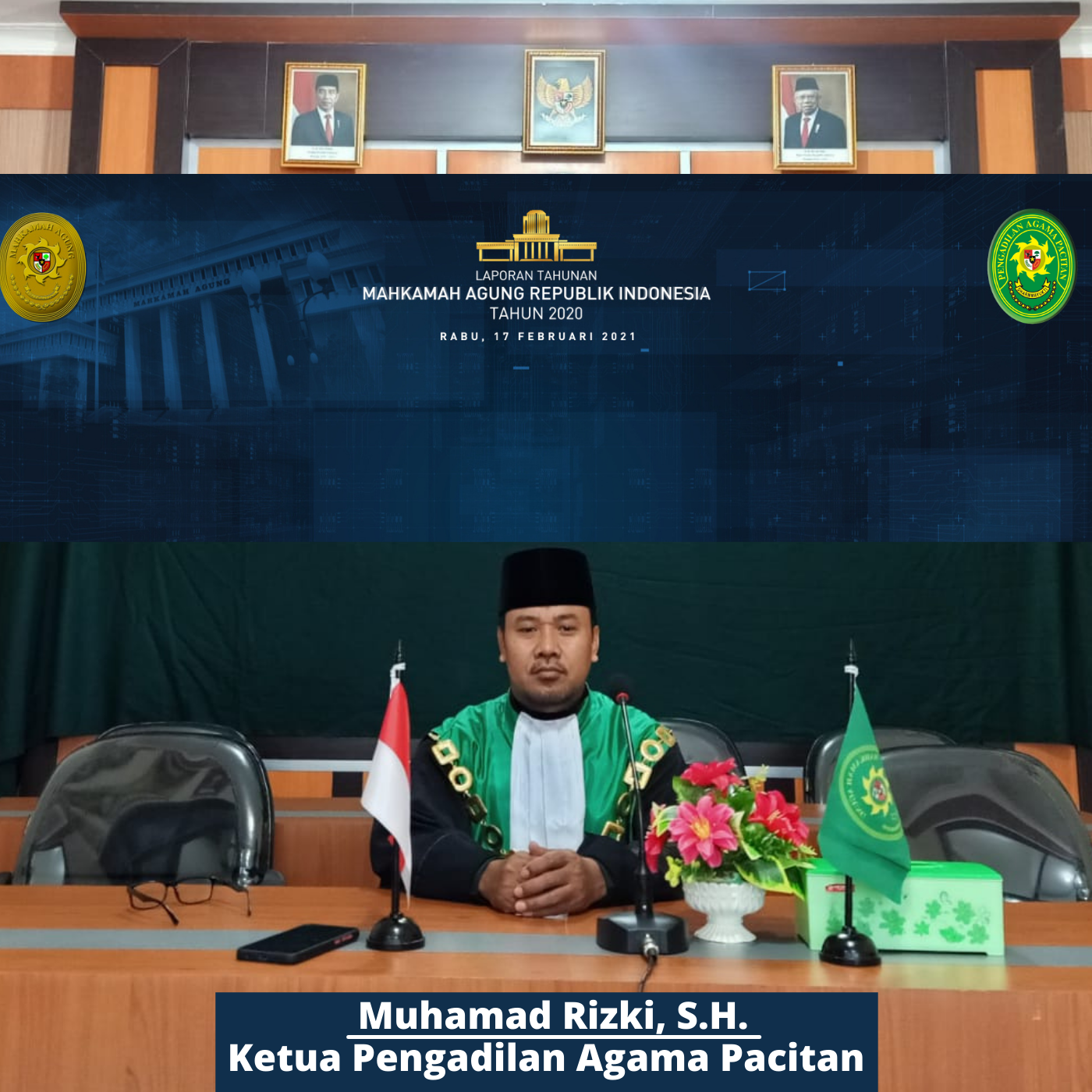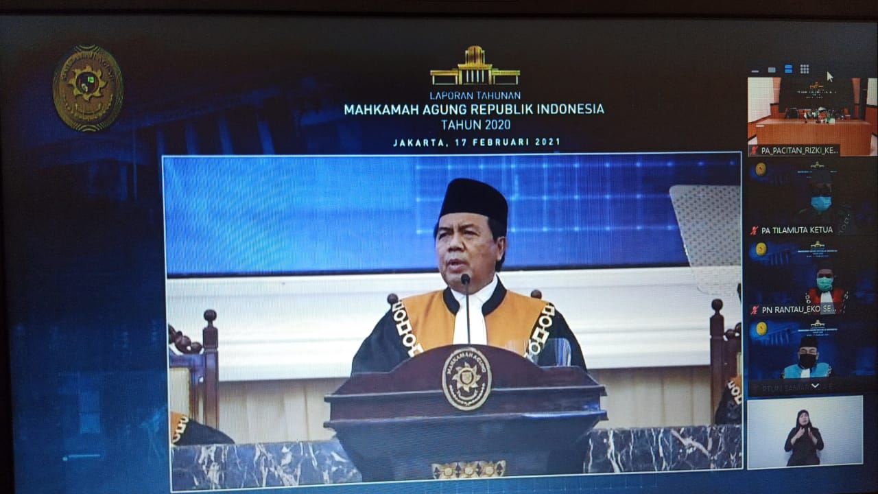 Pacitan Rabu tanggal 17 Februari 2021 Pukul 10 :00 WIB , Ketua Pengadilan Agama Pacitan Bapak Muhamad Rizki, S.H. mengikuti Acara Sidang Istimewa Laporan Tahunan Mahkamah Agung Republik Indonesia tahun 2020 USUNG TEMA “OPTIMALISASI PERADILAN MODERN BERKELANJUTAN”, yang diadakan oleh Mahkamah Agung Republik Indonesia secara Vicon .