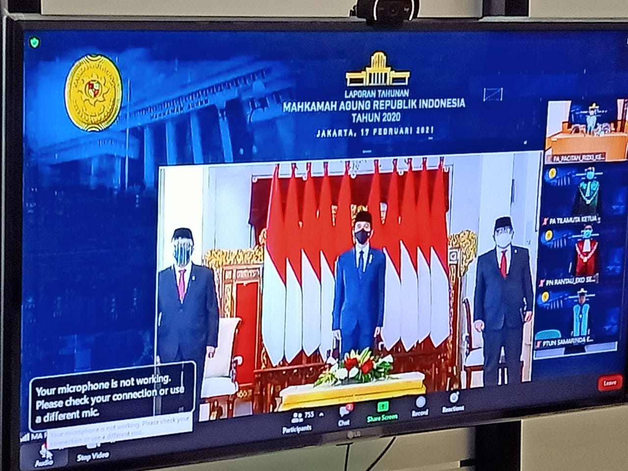 Sidang Pleno Tahunan Mahkamah Agung RI yang diikuti oleh Bapak Presiden RI dan Wakil Presiden, seluruh Pimpinan Lembaga Tinggi Negara, para Menteri Kabinet Kerja, Ketua MA Singapura, Malaysia, Belanda, dan Hakim Agung Arab Saudi serta Bahraian, Duta Bersar negara sahabat, Ketua Tingkat Banding empat peradilan dan Ketua tingkat pertama provinsi di 4 lingkungan peradilan.